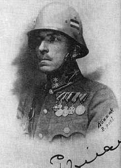 - ↑ Bodó, Paramilitary 2004, S. 136; In anderen Quellen wird er aber weiterhin als alezredes bezeichnet, ihm war aber bereits 1921 einmal die Berechtigung zum Führen des Dienstgrades aberkannt worden, die weitere Führung trug ihm die Verurteilung wegen Amtsanmaßung ein. Bereits 1931 war die Diskussion aufgekommen, ob der den Titel führen durfte. Im Kaufvertrag für sein Haus wird er als Oberstleutnant in Rente bezeichnet.