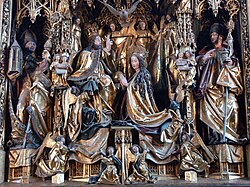 Im reich vergoldeten Hauptabschnitt kniet die gekrönte Maria vor ihrem Sohn. Die Mutter Gottes und Himmelskönigin soll hier auch die Fürbitten der Menschen vortragen. Die beiden sind umgeben von 16 Engeln, von denen einige musizieren, andere kostbare Tücher und Gewänder halten. Der Hl. Geist in Form einer Taube schwebt über den beiden. Dass eine Marienkrönung durch Christus im Beisein des Heiligen Geistes aber ohne Gottvater dargestellt wird, ist beispiellos in der Bildtradition. Entweder nimmt nur Christus oder Gottvater die Zeremonie vor, oder Maria wird in Anwesenheit der Dreifaltigkeit gekrönt.[3]