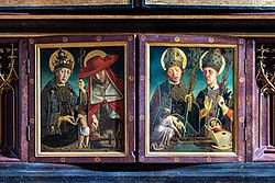 | Die vier lateinischen Kirchenväter an den geschlossenen Flügeln der Predella des Pacher-Altars der katholischen Pfarr- und Wallfahrtskirche St. Wolfgang im Salzkammergut , Oberösterreich. Michael Pacher , 1471–79, aufgestellt 1481. | Eigenes Werk | Uoaei1 | Datei:St. Wolfgang kath. Pfarrkirche Pacher-Altar Predella geschlossen 01.jpg | |