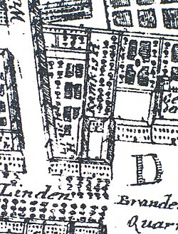 | Perspektivische Lageplanzeichnung des Palais Kameke an der Ecke Pariser Platz / Unter den Linden in Berlin im Jahr 1773; im Garten bezeichnet: Kamkis H.(aus). | vergrößerter Ausschnitt aus dem Kupferstich-Stadtplan: "Die Königl. Residenz Berlin..." | J. D. Schleuen | Datei:Berlin Lageplan Palais Kameke.jpg | |