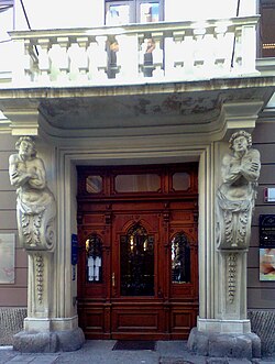 Ein Großteil der Fassade des dreigeschoßigen Baukörpers wurde beim Wiederaufbau nach dem Bombenangriff im November 1944 nur sehr vereinfacht rekonstruiert. Die Originalfassade ist auf Seite der Hans-Sachs-Gasse ist jedoch erhalten geblieben. Das ehemals rundbogige Steinportal besitzt links und rechts zwei Atlantenhermen, die den Mittelbalkon halten. Es wurde im Jahr 1710 unter dem Einfluss der Wiener Atlantenportale geschaffen. Diese figurale Portalrahmung ist in Graz einzigartig.
