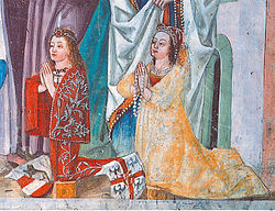 | Graf Leonhard von Görz und seine Frau Paula Gonzaga Fresko in der Kapelle von Schloß Bruck, Lienz | eingescannt aus: Alois Niederstätter: 1400 - 1522:das Jahrhundert der Mitte: an der Wende vom Mittelalter zur Neuzeit, aus der Reihe Österreichische Geschichte, Wien 1996, ISBN 3-8000-3532-4 | Autor/-in unbekannt Unknown author | Datei:205Leonhard von Görz und Paula Gonzaga.jpg | |
