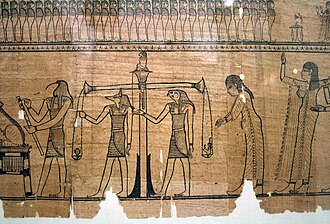 | Detail aus dem Totenbuch der Taruma: rechts neigt sich die Verstorbene über die mit der Hieroglyphe der Wahrheit beschwerte Waagschale, in der linken Schale ihr Herz, in der Mitte der falkenköpfige Horus und Anubis mit dem Kopf eines Schakals, das Protokoll führt der ibisköpfige Thot ; 3. bis 2. Jh. v.Chr./ ?. Dynastie ( Papyrussammlung und Papyrusmuseum Wien , Österreich ). | Eigenes Werk | Manfred Werner - Tsui | Datei:Sesostris' boook of the dead, Papyrusmuseum Wien.jpg |