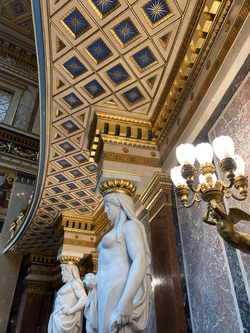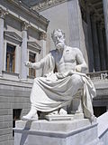 An der Auffahrtsrampe des Parlamentsgebäudes finden sich acht aus Laaser Marmor gemeißelte Sitzstatuen: auf der Seite des ehemaligen Herrenhauses Statuen der griechischen Geschichtsschreiber Xenophon, Thukydides, Herodot und Polybios, auf der Seite des ehemaligen Abgeordnetenhauses Statuen der römischen Geschichtsschreiber und Politiker Sallust, Caesar, Livius und Tacitus.[9]