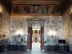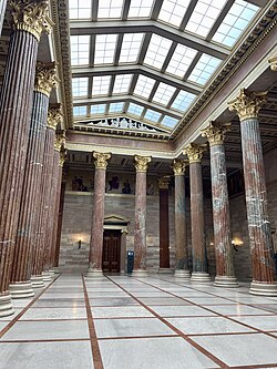 Im Verlauf der Kriegshandlungen wurde das Wiener Parlamentsgebäude stark durch Bomben in Mitleidenschaft gezogen. Am 7. Februar 1945 zerstörte ein Treffer zwei der insgesamt 24 monolithischen, aus einem rotgrauen Kalkstein vom Typ Rot-Grau-Schnöll aus Adnet (Salzburg) bestehenden Säulen der zentralen Halle. Die beiden zerstörten Säulen wurden 1950 durch zwei neue, aus demselben Steinbruch gebrochene ersetzt.[26] Die beiden ersetzten Säulen stehen nebeneinander und sind aufgrund der bräunlicheren Farbgebung des Marmors, der fehlenden weißen Marmorierung sowie leicht veränderter Fundamente erkennbar. Der südlich gelegene Herrenhaustrakt wurde ebenfalls schwer in Mitleidenschaft gezogen, der Plenarsaal des Herrenhauses fast komplett zerstört.