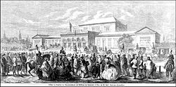 Da 1861 kein Parlamentsgebäude bestand, mussten dringend Provisorien geschaffen werden. Der provisorische Bau für das Abgeordnetenhaus des Reichsrats in Wien wurde nach dem Ministerpräsidenten Anton von Schmerling etwas despektierlich Schmerlingtheater genannt. Der noch spöttischere Name war „Bretterbude“.[13] Die andere Kammer des Reichsrats, das Herrenhaus, nutzte als Versammlungsort das historische Landhaus in der Herrengasse 13 in der Altstadt, Tagungsort des Landtags von Österreich unter der Enns.
