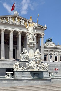 Der von Theophil von Hansen entworfene Pallas-Athene-Brunnen vor dem Parlament wurde erst 1898 bis 1902 erbaut, obwohl die Pläne schon seit 1870 bestanden. Die Figuren, eine vier Meter hohe Pallas Athene, Allegorien der gesetzgebenden und der vollziehenden Gewalt, sowie der vier wichtigsten Flüsse Altösterreichs – Donau, Inn, Elbe und Moldau – wurden von den Bildhauern Hugo Haerdtl, Josef Tautenhayn und Carl Kundmann geschaffen. Dass Pallas Athene, die griechische Göttin der Weisheit, dem Parlamentsgebäude den Rücken zukehrt, führte im österreichischen Volksmund zu verschiedenen Witzen und Spottworten, wonach die Weisheit nicht im Parlament anzutreffen sei.[6]