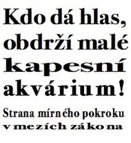 | Wahlkampfslogan der "Partei für gemäßigten Fortschritt in den Schranken der Gesetze" (Kandidat: Jaroslav Hašek), Österreichische Parlamentswahlen zum Abgeordnetenhaus 1911. Deutsche Übersetzung: "Jeder unserer Wähler bekommt ein Taschenaquarium." | Eigenes Werk | Tvwatch | Datei:Jaroslav Haseks party slogan 1911.jpeg | |