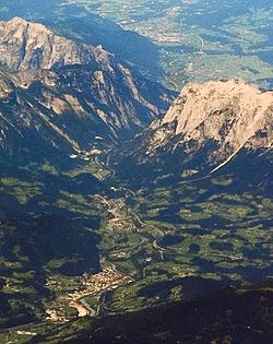 | Pass between Tennengebirge and Hagengebirge (near the town Werfen) | Eigenes Werk | Andrzej Otrębski | Datei:Werfen aerial.jpg |