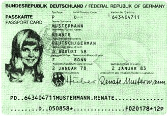 | Bundesrepublik Deutschland, Passkarte von Renate Mustermann | http://akziv.de/haupt/erika/renate.html | Bundesrepublik Deutschland, Bundesministerium des Innern | Datei:Mustermann Passkarte 1978.jpg | |