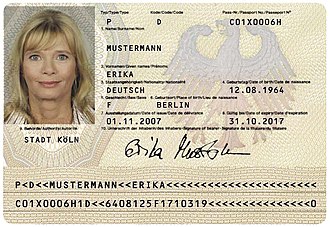 | Datenseite des deutschen Reisepasses von Erika Mustermann (Muster 2007). | Bundesministerium des Innern: Elektronische Reisepässe in Deutschland. | Bundesrepublik Deutschland, Bundesministerium des Innern | Datei:Mustermann Reisepass 2007.jpg | |