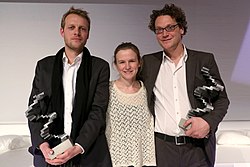 | Regisseur Paul-Julien Robert (l.), Produzentin Sabine Moser und Produzent und Cutter Oliver Neumann , ausgezeichnet für den besten Dokumentarfilm und den besten Schnitt für " Meine keine Familie ", bei der Vergabe des Österreichischen Filmpreises 2014 (Auditorium von Schloss Grafenegg , Niederösterreich ). | Eigenes Werk | Manfred Werner - Tsui | Datei:Österreichischer Filmpreis 2014 C Paul-Julien Robert, Sabine Moser, Oliver Neumann.jpg |