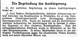 Paul Bekker wurde im Nationalsozialismus als „durch die unzweifelhaften, einseitig angewandten Fähigkeiten eines zersetzend kritischen Verstandes eine besondere Gefahr darstellend“ angesehen.[23]