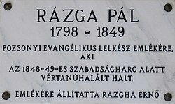 | Pál Rázga commemorative plaque in Budapest District III, Dévai Bíró Mátyás Square No 1. | Übertragen aus hu.wikipedia nach Commons. | Fekist in der Wikipedia auf Ungarisch | Datei:RázgaPál Dévai Bíró Mátyás1.jpg | |