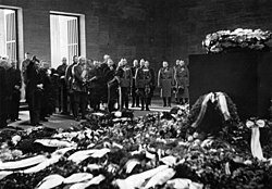 | Es folgt die historische Originalbeschreibung , die das Bundesarchiv aus dokumentarischen Gründen übernommen hat. Diese kann allerdings fehlerhaft, tendenziös, überholt oder politisch extrem sein. Berlin, Kranzniederlegung im Ehrenmal Scherl BilderdienstHindenburg und Hitler zum Volkstrauertag 1933 im Berliner Reichsehrenmal Unter den Linden Abgebildete Personen: Hindenburg, Paul von Beneckendorff und von : Reichspräsident, Generalfeldmarschall, Deutschland ( GND 118551264 ) Hitler, Adolf: Reichskanzler, Deutschland | Dieses Bild wurde im Rahmen einer Kooperation zwischen dem deutschen Bundesarchiv und Wikimedia Deutschland aus dem deutschen Bundesarchiv für Wikimedia Commons zur Verfügung gestellt. Das deutsche Bundesarchiv gewährleistet eine authentische Bildüberlieferung nur durch die Originale (Negative und/oder Positive), bzw. die Digitalisate der Originale im Rahmen des Digitalen Bildarchivs . | Unbekannt Unknown | Datei:Bundesarchiv Bild 183-2008-0909-501, Berlin, Kranzniederlegung im Ehrenmal.jpg | |