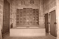 | Es folgt die historische Originalbeschreibung , die das Bundesarchiv aus dokumentarischen Gründen übernommen hat. Diese kann allerdings fehlerhaft, tendenziös, überholt oder politisch extrem sein. Tannenberg-Denkmal, Beisetzung Hindenburg 1934Feier im Tannenberg Denkmal während der Rede des Führers Hohenstein / Ostpreußen.- Tannenberg-Denkmal ("Tannenberg-Nationaldenkmal" / "Reichsehrenmal Tannenberg").- Beisetzung von Paul von Hindenburg, Rede von Adolf Hitler Abgebildete Personen: Hindenburg, Paul von Beneckendorff und von : Reichspräsident, Generalfeldmarschall, Deutschland ( GND 118551264 ) Hitler, Adolf: Reichskanzler, Deutschland Additional Description This photograph was taken 7 August 1934 at Paul von Hindenburg's original burial in the central yard of the Tannenberg Memorial, and not during his reinterrment in the new crypt on 2 October 1935. Other photographs show that the cross in this photo was absent from the yard upon the crypt's completion. Crypt construction necessitated lowering of the entire yard by an additional 8 feet, with steps more than 50 feet deep all around, with the yard's flat area being much reduced and having a solid granite surface, and none of this is seen in this photograph. Films that match the scene in this photograph exist that show the coffin being lowered into the ground, and not placed in the crypt (which had a horizontal entrance). | Dieses Bild wurde im Rahmen einer Kooperation zwischen dem deutschen Bundesarchiv und Wikimedia Deutschland aus dem deutschen Bundesarchiv für Wikimedia Commons zur Verfügung gestellt. Das deutsche Bundesarchiv gewährleistet eine authentische Bildüberlieferung nur durch die Originale (Negative und/oder Positive), bzw. die Digitalisate der Originale im Rahmen des Digitalen Bildarchivs . | Unbekannt Unknown | Datei:Bundesarchiv Bild 183-2006-0429-502, Tannenberg-Denkmal, Beisetzung Hindenburg.jpg | |