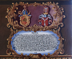 | Wappentafel von Paul von Jägerndorf, Fürstbischof von Freising, im Fürstengang zwischen Fürstbischöflicher Residenz und Freisinger Dom. Links das geistliche, rechts das persönliche Wappen, darunter ein lateinischer Text mit kurzer Biographie. | Photo from the Fürstengang in Freising | Franz Joseph Lederer (1676-1733) and others | Datei:Fürstengang Tafel 36 - Paul von Jägerndorf.jpg | |