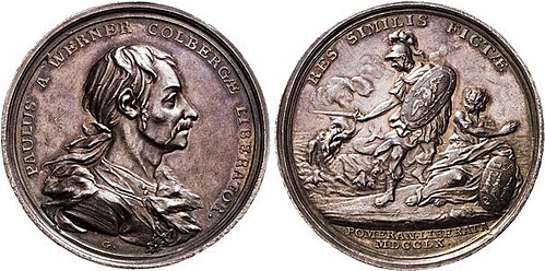 | preußische Gedenkmünze von 1760, zur erfolgreichen Verteidigung von Kolberg, Vorderseite General von Werner, Rückseite alegorische Scene | http://www.coinarchives.com/e78e9bf6d729647d009ab182d8f9ec5e/img/leipzig/070/image01358.jpg | Sulzer (?), 1 | Datei:Gedenkmunze kolberg werner-vorder+rueckseite.jpg |