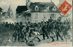 | Carte postale ancienne éditée par GF N° 125 PANTIN : La défense contre les alliés en 1814. La source de cette illustration n'est pas mentionnée | Collection personnelle | Scanné par Claude Shoshany | Datei:GF 125 - PANTIN - La défense contre les alliés en 1814.JPG | |