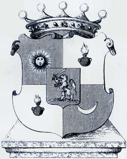 1818: Quadriert mit Mittelschild, der in Schwarz auf einem Dreihügel einen gekrönten goldenen Löwen zeigt, welcher in der rechten Pranke ein Schwert schwingt, in der Linken eine Tartsche vor sich hält. Im ersten, roten Feld eine strahlende Sonne; im zweiten und dritten silbernen Feld eine brennende Bombe: im vierten, roten Feld ein Halbmond. Auf dem Schild ruht die Freiherrnkrone.[12]