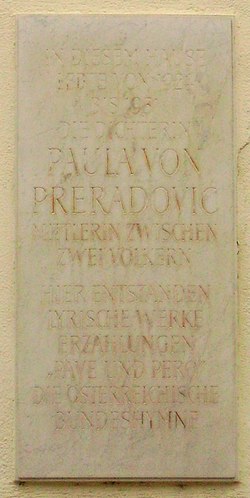 | Gedenktafel für Paula Preradović in Wien 19., Osterleitengasse 7. | Eigenes Werk | Walter Anton | Datei:Paula Preradovic Gedenktafel Wien 19 Osterleitengasse 7.tif | |