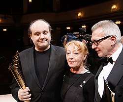 | Paulus Manker (Publikumspreis), Ulrike Kaufmann (Lebenswerk) und Erwin Piplits (Lebenswerk) bei der Verleihung des Nestroy-Theaterpreises 2010 im Burgtheater in Wien . | Eigenes Werk | Manfred Werner - Tsui | Datei:Nestroy 2010 (45) Paulus Manker, Ulrike Kaufmann, Erwin Piplits.jpg | |