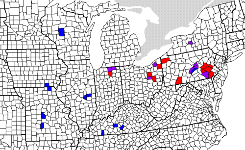 | The distribution of the Pennsylvania German language in the United States. Blue counties are the 20 counties with the highest proportion of Penna. German speakers, red counties are the 20 counties with the highest number of Penna. German speakers. (Purple counties are both red and blue.) | Own work; base map is Image:Map of USA with county outlines (black & white).png , data is from http://www.usefoundation.org/userdata/file/Research/Languages/pennsylvania_dutch.pdf (archived) | Angr | Datei:Pennsylvania German distribution.png | |