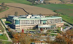 | Ostansicht des Rehabilitationszentrums (Rehab) der Pensionsversicherungsanstalt in der steiermärkischen Gemeinde St. Radegund bei Graz. Ab 2010 (Grundsteinlegung am 16.6.) wurde westseitig der alten Rehab-Anlage (von 1969 bis 1973 errichtet) auf einer Fläche (Bruttogeschossfläche) von rund 24.500 m² und nach Plänen des Architekten Hans-Jörg Tschom ein neues Rehab-Zentrum (Herz-Kreislauf-Rehabilitation) gebaut ( 1 , 2 ) und am 13. Juni 2014 feierlich eröffnetː 3 . Die neue Sonderkrankenanstalt am Südosthang des Schöckls hat 128 Einzelzimmer, eine Betten- (8 Einzel- und 7 Doppelzimmer) und eine Überwachungsstation (5 Einzel- und 2 Doppelzimmer)ː 4 . | Eigenes Werk | C.Stadler/Bwag | Datei:St. Radegund bei Graz - PVA-Rehabilitationszentrum.JPG | |