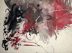 „Häufig überwältigt mich die Aktion im Bild und führt mich fort bis zu jener fixierten Lesbarkeit oder aber bis zur völligen Erschöpfung. Manchmal kommt es zur Auslöschung und Vernichtung, es bleibt eine farbdurchtränkte Leinwand als neuerlicher Malgrund bestehen.“[9] „Ich beschäftigte mich mit der informellen Malerei, mit heftig aufgegossenen Farbgerinnseln, ineinanderfließenden Farbbahnen, welche hart auftrockneten und vom durchleuchteten Hinter(Unter-)-grund sich abhoben und eine Einstiegsluke – einen begehbaren Weg – bloßlegten...Ich nahm mir vor, solche „Intuitionsskizzen“ als tragendes Bildthema mit einer Farbbeschränkung von Weiß, Schwarz und dunklem Rot (Krapplack) zu nehmen und die weiße Leinwand mit kalligrafischen unleserlichen – chinesisch-ähnlichen – Schriftzeichen, mit einem Himmelsausschnitt zu füllen.“[10] „In der Gewissheit, eine meinem Temperament entsprechende Malweise gefunden zu haben, begann eine Sturzflut von Arbeiten einzusetzen... Diese automatische Maltechnik, der etwas wohltuend Befeiendes anhaftet, wurde schon vor mir von anderen Künstlern angewendet und kultiviert. Den freien Farbfluß, das Hineinfließen, die Farbe in „dripping“ auf der Leinwand zerstoben zu sehen oder in rasch hingesetzten aufgepeitschten Pinselhieben, entdeckte ich zuerst in den Werken von Pollock und Mathieu.“[11]