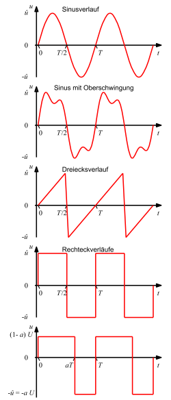 In Bezug auf Schwingungen sind Perioden als Größe der Zeit definiert und werden auch als Periodendauer oder Schwingungsdauer (selten: Schwingungszeit) bezeichnet.[1] Sie erhalten für gewöhnlich das Formelzeichen und werden in der Maßeinheit Sekunde angegeben. Beispiele für periodische Funktionen in Form von Wechselspannungen zeigt das Bild.