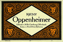 | Weinetikett entworfen von Peter Behrens für Wilhelm Gerstung für einen 1912er Oppenheimer. | Zeitschrift „Das Plakat“, 1913 | Peter Behrens | Datei:1912er Oppenheimer.jpg | |