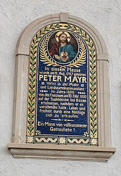Am 30. September 1900 wurde in Bozen, nach Entwurf Georg von Hauberrissers, an Pfarrplatz ein Denkmal enthüllt, das unter einem neugotischen, mit einem Kruzifix geschmückten Oberbau ein Relief trug, das die Gefangennahme Mayrs durch die Franzosen darstellte. Unter dem Relief war ein entsprechender Text angebracht. Bei der Bombardierung Bozens im Zweiten Weltkrieg wurde der helmförmige Aufsatz 1943 zerstört und das Denkmal schwer beschädigt. 2009 wurde es anlässlich des 200-Jahr-Jubiläums des Tiroler Freiheitskampfes neu errichtet.[3]
