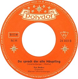 „Da sprach der alte Häuptling“ Single-B-Seite zu „Wooden Heart“ von Gus Backus (Polydor 24 403). | https://images.45cat.com/gus-backus-wooden-heart-mus-i-denn-zum-stadtele-hinaus-1960-2.jpg | Polydor | Datei:Polydor 24 403 Da sprach der alte Häuptling.jpg |