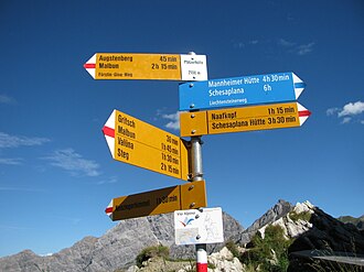 | Wegweiser an der Pfälzerhütte | Eigenes Werk | ANKAWÜ | Datei:FL - Pfälzerhütte - Wegweiser.jpg | |