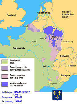 - ↑ Heinz Duchhardt: Das Reich und die europäische Staatenwelt 1648–1806. München 1990, S. 22. Pierre Gaxotte: Ludwig XIV. Frankreichs Aufstieg in Europa. Bergisch Gladbach 1973, S. 279f.