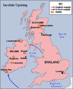 Mit französischer Hilfe stellte Jakob II. eine Armee von etwa 30.000 Mann[31] auf. Allerdings waren die Soldaten wenig erfahren und schlecht versorgt. Die Armee belagerte die protestantische Stadt Londonderry, musste die Belagerung aber schließlich wieder abbrechen. Wilhelm III. landete 1690 mit einer Truppe von 35.000 Mann[32] in Irland unter dem Kommando von Friedrich von Schomberg. Dieser war Hugenotte und früher Marschall von Frankreich gewesen. Die alliierten Truppen marschierten auf Dublin. Jakob II. versuchte seinerseits, dieses Aufgebot mit 23.000[32] Iren und Franzosen in der Schlacht am Boyne aufzuhalten. Wilhelm III. siegte und Jakob II. floh zurück nach Frankreich.
