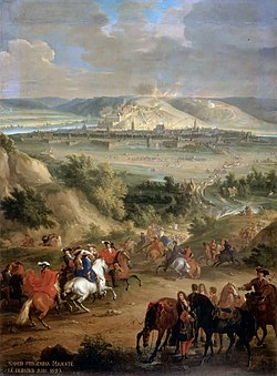 Für die Hoffnung auf einen kurzen Feldzug spricht, dass die Armee, die am 24. September 1688 den Rhein bei Straßburg überquerte, nur 40.000 Mann[20] stark war. Sie stand unter dem Kommando des Dauphins Louis de Bourbon und des Marschalls Duras. Erstes Kriegsziel war die Festung Philippsburg. Sébastien Le Prestre de Vauban übernahm den Befehl bei der Belagerung, die im Oktober 1688 erfolgreich war. Zwei Wochen später fiel die Festung Mannheim. Kurze Zeit später eroberten die Franzosen die Festung Frankenthal. Vom Kriegsausbruch überrascht, ergaben sich im weiteren Verlauf der ersten Kriegswochen Mainz und Heidelberg. Französische Truppen griffen weit darüber hinaus bis Ulm und Mergentheim aus, um das Land auszuplündern und Kontributionen einzutreiben. Bei Widerstand oder unzureichenden Kontributionen wurden die besetzten Orte häufig zerstört. Bei den militärischen Operationen in Deutschland kam es zu keiner einzigen Feldschlacht. Die Machtdemonstration der Franzosen und der angerichtete Schaden sollte die Gegenseite dazu zwingen, die Bedingungen Ludwigs XIV. zu akzeptieren, was sich aber nicht erfüllte.[20]