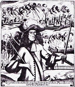 Auf Anraten seines Kriegsministers Louvois ließ Ludwig XIV. auf dem Rückzug die Pfalz und angrenzende Gebiete im Vorfeld der eigenen Festungen systematisch verwüsten. Dörfer, Burgen und Festungen und ganze Städte wurden in der Pfalz, im nördlichen Kurtrier und in der Markgrafschaft Baden zerstört. Ezéchiel de Mélac trug dazu als französischer General maßgeblich bei.[24] Ab dem Januar 1689 wurden planmäßig elf Dörfer des Oberamts Heidelberg südlich des Neckars niedergebrannt, nachdem die Bewohner vertrieben worden waren. Vor dem Widerstand kursächsischer Truppen bei Weinheim wichen die Franzosen zurück und legten unter Ausschreitungen gegen die Bevölkerung Handschuhsheim in Schutt und Asche. In Heidelberg wurden nur die Befestigungen von Schloss und Stadt gesprengt, der französische Stadtkommandant Graf Tessé begnügte sich seinen Oberen gegenüber mit einigen kleineren Feuern in der Stadt, die letztlich nur 34 Häuser zerstörten. Mannheim dagegen wurde als Festungsstadt dem Erdboden gleichgemacht. Die französischen Truppen wandten sich daraufhin nach Süden und setzten ihr Zerstörungswerk am mittleren Oberrhein (Mühlburg, Durlach, Ettlingen und Pforzheim, Baden-Baden mit dem Neuen Schloss) und im Kraichgau (Bretten) fort.