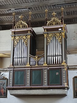Die bestehende Orgel[6] wurde 1858 errichtet und stammt von Ludwig Mauracher, vorher war ein Positiv mit vier Registern vorhanden gewesen. 1858 schrieb der Pfarrer, dass „sich einheimische u. auswärtige Wohltäter herbeigelassen“ [hätten], „zur Herstellung einer ganz neuen Orgel 600 fl. C.M. beytragen zu wollen“.[7] Der Erbauer, Ludwig Mauracher, galt bei den Behörden als unzuverlässiger Orgelbauer, das Konsistorium genehmigte dieses Vorhaben daher mit der wohlweislichen Aufforderung, der Pfarrer möge alle „gehörigen Vorsichten“ walten lassen, damit die „neue Orgel von dem genannten Orgelbauer solid u. dauerhaft hergestellt“ werde.[8] 1888 wurde über der Orgelempore noch eine Volksempore eingezogen.[9] 1991 wurde die Orgel durch Fritz Mertel saniert.