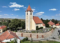 Die Kirche steht erhöht mittig im Ort mit einem Friedhof mit einer Böschungsmauer umgeben. Die barockisierte gotische Kirche hat einen mächtigen – weithin sichtbaren – Turm.