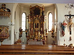 Der Hochaltar aus der Mitte des 18. Jahrhunderts mit einem dreizonigen Aufbau mit schräg gestellten Säulen hat ein reich profiliertes ausladendes Gesims und einen Aufsatz mit einem Dreiecksgiebel. Das fehlende Altarblatt in einem Rokoko-Strahlenkranzrahmen mit Putten wurde mit einer Kopie des Bildes Mariahilf nach Lukas Cranach ersetzt.