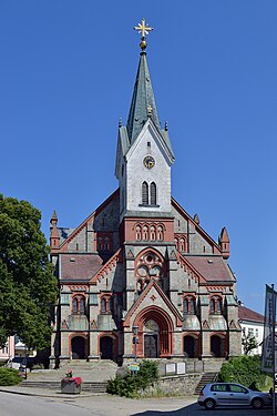 Der massige stark gegliederte Außenbau hat Granitsteinoberflächen und Sichtziegelelementen und gestufte Strebepfeiler. Das Mittelschiff steht unter einem Walmdach, die Seitenschiffe haben Pultdächer, im Osten über dem Chor ist ein Dachreiter. Die Westfassade ist zweigeschoßig, das Mittelportal mit einer breiten profilierten Leibung und einem gedrungenen Spitzbogen ist übergiebelt, darüber sind neogotische Gruppenfenster, seitlich vom Mittelportal sind vier Segmentbogenportale und darüber Fenster mit Segmentbogenüberdachungen. Die Westfassade schließt mit Gesimsen mit Zahnschnittfriesen und Bogenfriesen. Die Seitenfassaden haben über einer zum Teil durchfensterten Sockelzone breite Gruppenfenster und je Seite zwei Portale mit einer Mittelnische als Dreigiebelgruppe. Über den Portalzonen und dem Ostjoch sind verschieden hohe Fassadengiebel. Der Chor hat in der Attikazone Blendarkaden und wird von zwei Treppentürmen flankiert.