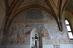 Im Inneren findet sich ein gotisches Fresko, das erst 1985/86 freigelegt wurde, in das beginnende 14. Jahrhundert datiert wurde und in einem romanisch-gotischen Übergangsstil ausgeführt ist. Das Raumkonzept in roten Sternen auf blauem Grund an Gewölbe und Zwickeln zeigt Darstellungen der Verkündigung an Maria, die Hirtenverkündigung, die Geburt Christi und die Anbetung der Könige, an der Südwand sind die Hl. Katharina von Alexandrien mit dem Rad und die Hl. Barbara mit dem Kelch identifizierbar, sonst sind fragmentierte Heiligendarstellungen um eine Mittelfigur zu finden.