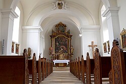 Das Hochaltarbild mit dem heiligen Valentin wurde wiederverwendet und zierte schon den Barockaltar. Kunsthistoriker vermuten, dass es von Altomonte, wahrscheinlicher aber von Johann Karl von Reslfeld gemalt wurde. Die Kirchenbänke wurden 1893 vom Ansfeldner Tischlermeister Seiberl gefertigt. Die schön verzierten Seitenteile wurden ebenfalls vom Ansfeldner J. Weismayr geschnitzt, der dieses Handwerk während seiner Haftzeit in Garsten erlernte. Bei der letzten Kirchenrenovierung wurden die Fresken, die den Innenraum zierten, mit dem Sandstrahlgerät entfernt, und die Seitenaltäre fanden zusammen mit der Kanzel ihre wahrscheinlich letzte Ruhe auf dem Pfarrhofdachboden. Bei dieser Renovierung ließ Pfarrer Geiß auch eine Taufkapelle anbauen und eine Heizung installieren.