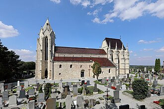 | Südsüdostansicht der Pfarr- und Wallfahrtskirche Mariae Himmelfahrt in der niederösterreichischen Marktgemeinde Bad Deutsch-Altenburg . Die Kirche wurde erhöht über dem Ort auf einer zur Donau steil abfallenden Terrasse errichtet und ist vom Friedhof und einer Umfassungsmauer aus Bruchsteinen umgeben. Das Langhaus ist eine romanische, dreischiffige und sechsjochige Pfeilerbasilika. Der vorgestellte hochgotische Turm im Westen stammt aus dem 3. Viertel des 14. Jahrhunderts. Der erhöhte, zweijochige gotische Chor wurde vermutlich vom Baumeister Michael Knab Ende des 14. Jahrhunderts errichtet. Insgesamt ist das Bauwerk ein bedeutendes Denkmal mittelalterlicher Architektur in Österreich. | Eigenes Werk | C.Stadler/Bwag | Datei:Bad Deutsch-Altenburg - Kirche (1).JPG | |