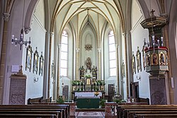 Das erhöhte Mittelschiff hat ein Sechsrautensterngewölbe, das südliche Seitenschiff ein Vierrautensterngewölbe, der Chor ein Netzrippengewölbe. Sämtliche Rippen im spätgotischen Bereich wurden 1909 rekonstruiert. Im ersten Joch des südlichen Seitenschiffes sind spätgotische Runddienste mit Rippenansatzfragmenten an der Südwand und der untere Teil eines Runddienstes am ersten Mittelschiffpfeiler von der ehemaligen spätgotischen Empore erhalten. Das barocke nördliche Seitenschiff ist kreuzgratgewölbt mit Stuckspiegeln mit Gurtbögen über Wandpilastern zwischen den Jochen. In der Westwand des Mittelschiffes ist ein spitzbogiges abgefastes Portal zum Turm. Das Turmerdgeschoß ist kreuzgratgewölbt mit einer Segmentbogenöffnung zum Turmobergeschoß. Das Sakristeiportal im ersten Chorjoch ist aus dem späten 17. Jahrhundert.