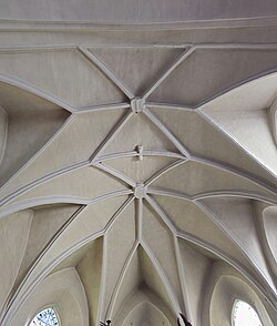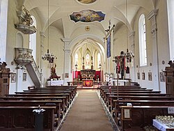 Das Kircheninnere zeigt ein vierjochiges Langhaus mit einem weit gespannten Stichkappentonnengewölbe auf einer Pilastergliederung. Die Doppelempore hat durch eingeschwungene Ecken eine zentrale Wirkung. Der Chorbogen ist eingezogen. Der zweijochige Chor mit einem Dreiachtelschluss wirkt im Verhältnis zum barocken Langhaus kapellenartig. Das Chorgewölbe hat Kreuzrippen mit einfach gekehlten Rippen mit vorgelagerten Runddiensten und zwei einfache Wappenschlusssteine. In der linken Chorwand befindet sich das spitzbogige Turmportal.