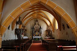 Im fünfjochigen Langhaus wurde in der Mitte des 19. Jahrhunderts das fünfte östlichste Joch als Chorbereich etwas erhöht. Das Langhaus hat ein weit gespanntes Netzrippengewölbe mit Schildbogenrippen, eine Rippe ist mit 1496 bezeichnet, auf tief sitzenden Ansätzen, mit Wappenkonsolen und Wappenschlusssteinen, im Osten mit Propst Bartholomäus und Freiherren von Puchheim nach 1522. Die dreiachsige Orgelempore, mit spitzbogigen Arkaden geöffnet, ist kreuzrippenunterwölbt mit Wappenschlusssteinen. Der Aufgang zur Empore ist eine spätgotische Spindeltreppe. Der romanische rundbogige Triumphbogen mit Rundwulstgesims wurde 1496 mit einer Wand geschlossen und 1720 renoviert und ist heute die Wand hinter dem Hochaltar. Das romanische Chorquadrat als Turmerdgeschoß hat ein verschliffenes Kreuzgratgewölbe. Südlich am Chorquadrat ist die heutige Sakristei als einjochige Kapelle mit einem Fünfachtelschluss und einem Kreuzrippengewölbe aus dem 15. Jahrhundert auf wohl älteren Konsolen mit Wappenschilden und Köpfchen. Der Turmzugang im Westen der Kapelle hat ein gefastes Portal.