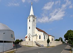 | Südwestansicht der röm.-kath. Pfarrkirche „Zur Kreuzerhöhung“ in der burgenländischen Marktgemeinde Deutschkreutz . Um 1670 wurde eine einschiffige, spätbarocke Saalkirche unter einem Tonnengewölbe anstelle einer Vorgängerkirche errichtet. Zu jener Zeit war auch noch der Friedhof um die Kirche herum. 1928 wurde die Kirche durch zwei Seitenschiffe erweitert und die Kirchhofmauer erneuert. In den Jahren 1973/74 kam es unter der Federführung von Prof. Anton Lehmden zu größeren Umbau- und Renovierungsarbeiten. Unter anderem erfolgte nordseitig ein Anbau mit einem hohem Rundgiebel. | Eigenes Werk | C.Stadler/Bwag | Datei:Deutschkreutz - Pfarrkirche.JPG | |