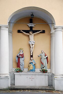 Die Kreuzigungsgruppe wird in das letzte Viertel des 18. Jahrhunderts datiert und entspricht dem religiösen Empfinden der Barockzeit über die Golgotha-Szene. Sie besteht aus einer Kreuzigungsdarstellung, zu deren Füßen sich Statuen der Muttergottes (links), der Hl. Maria Magdalena (sitzend zu Füßen des Gekreuzigten) und des Hl. Johannes (rechts) befinden. Als Künstler wird Josef Pogner genannt. Die Gruppe wurde 2014 renoviert und am 18. April 2014 neu geweiht.[62][13][14]